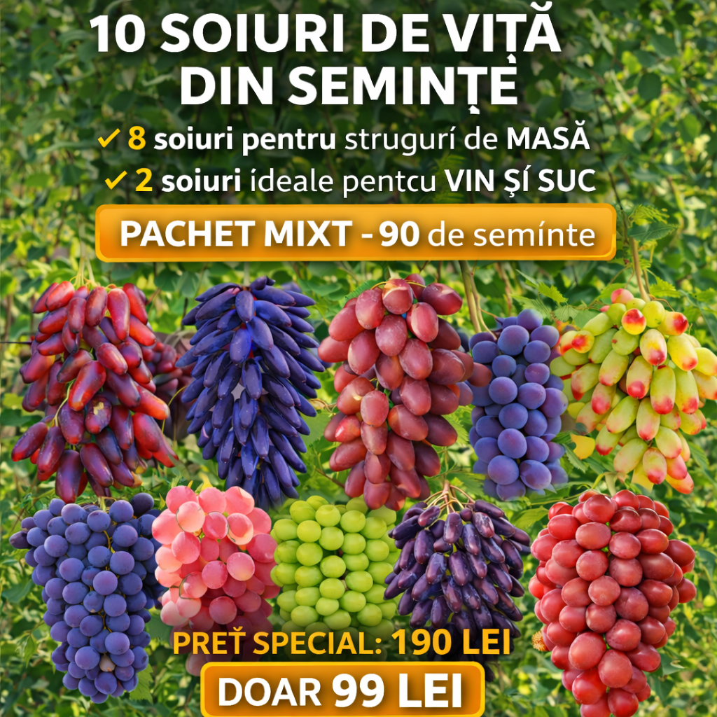 Acest pachet conține 10 soiuri diferite de viță de vie, obținute din semințe atent selecționate, potrivite atât pentru consum proaspăt, cât și pentru prepararea vinului sau a sucului de casă.